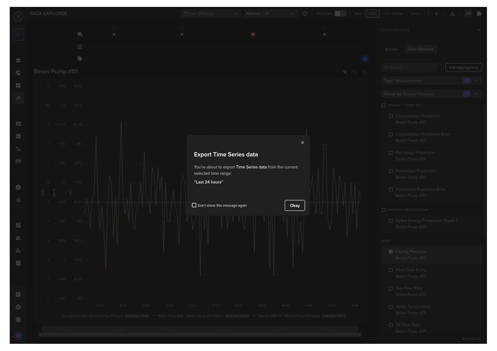 In this example we will get the mean value per hour over a 24 hour period for an Asset / Data Stream pair. The Asset name is pcp_01 and the Data Stream name is casing_pressure.