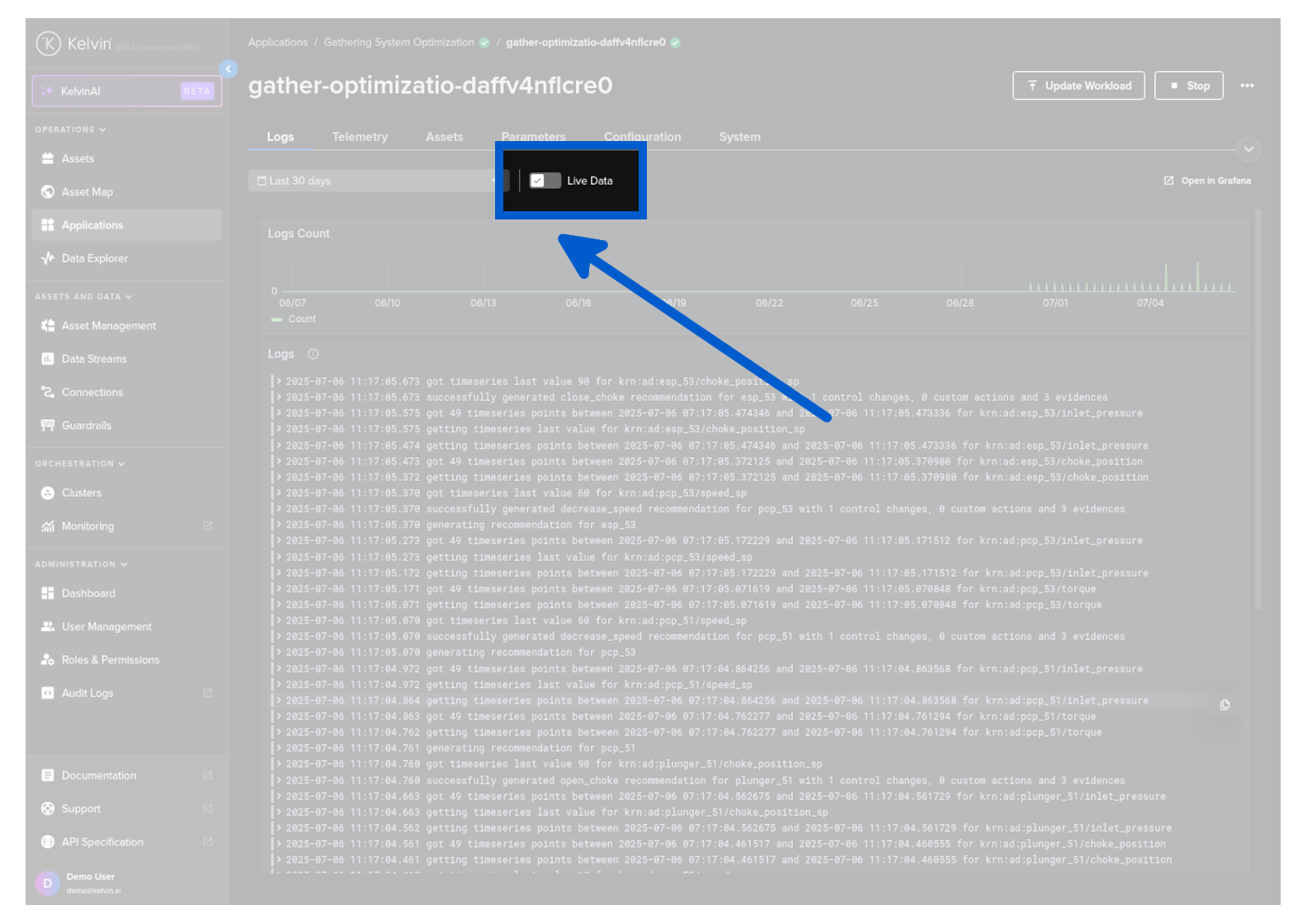 Use the Live Data toggle to switch between viewing Workload log data from the Edge or from the Kelvin Platform.