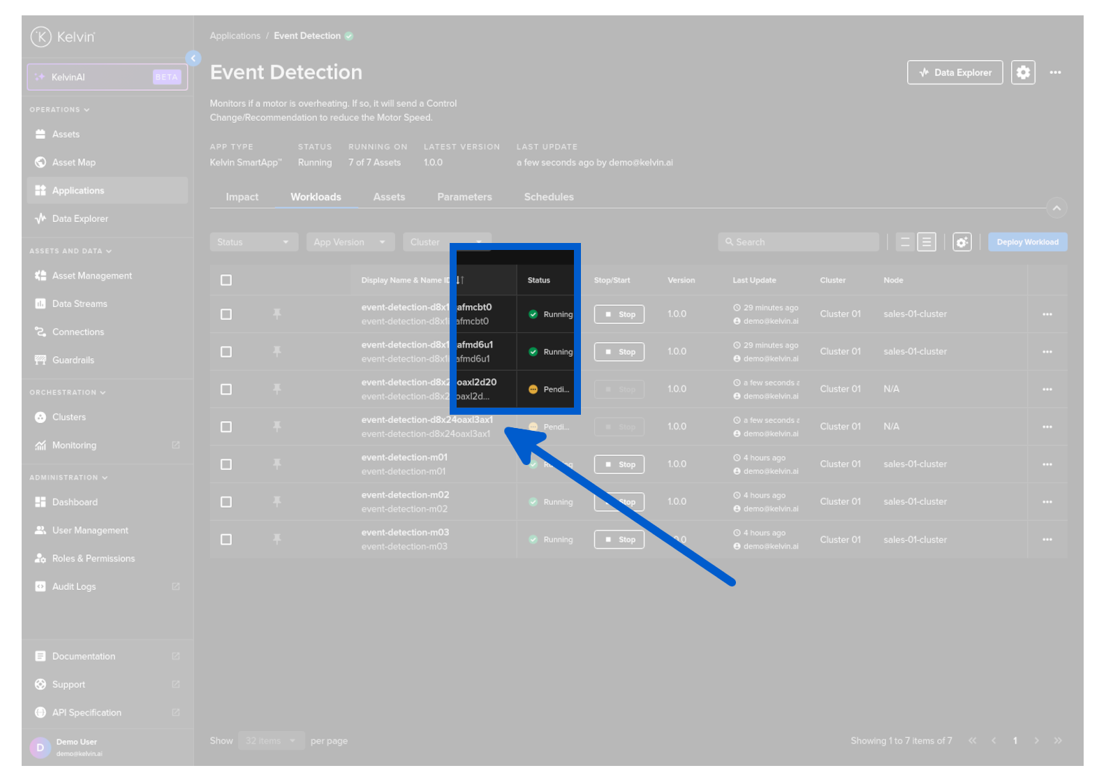 You can observe the workload being deployed to the assets. And in a couple of seconds the app will be running for the assets.