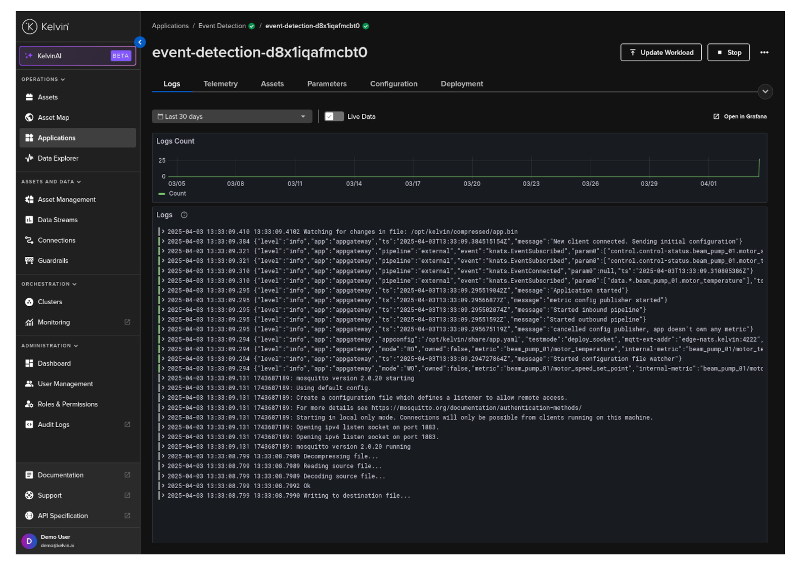 Now that your Kelvin SmartApp™ has been successfully deployed, it’s time to see it in action. We’ll guide you through how to visualize the recommendations and data, as well as provide troubleshooting with logs and telemetry of your Kelvin SmartApp™.