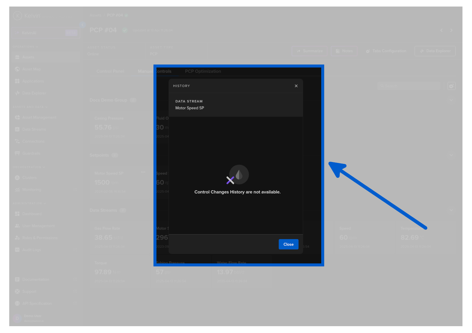 To see the history of Control Changes for a particular Asset / Data Stream pair, click on the hamburger menu in the card containing the data value of interest.