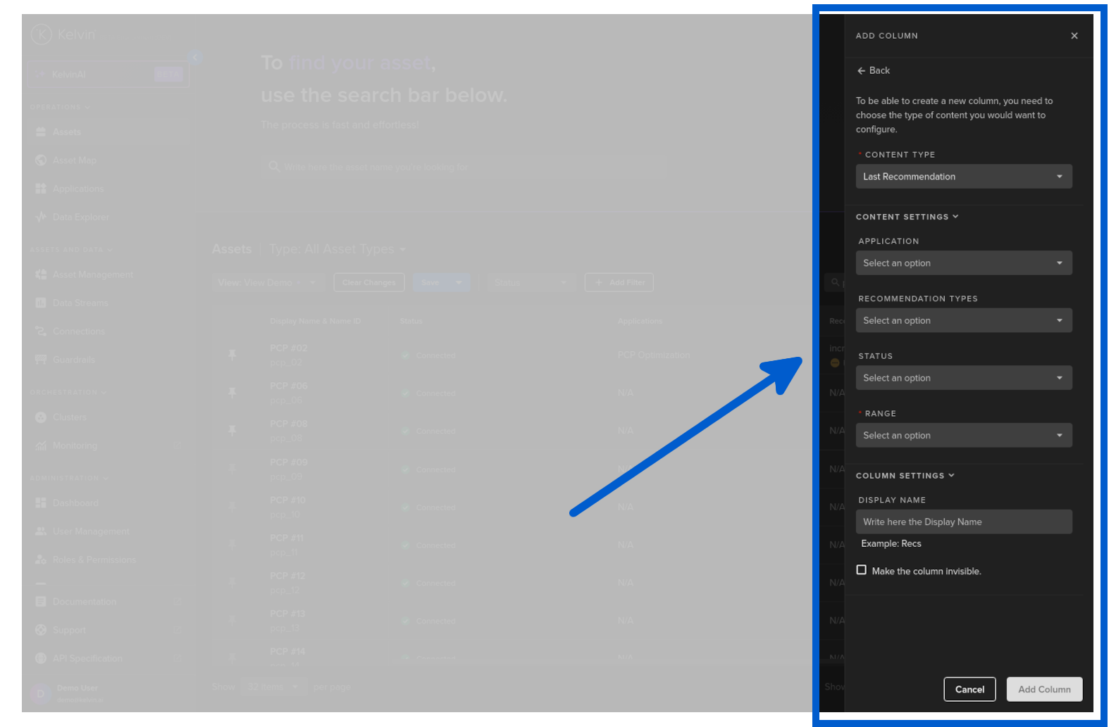 You can select which Recommendations associated with a Kelvin SmartApp™ over a defined period of time to be shown in the column for each Asset.
