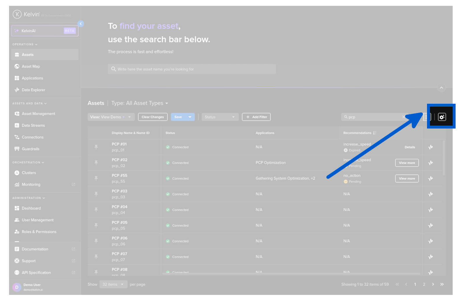 This uses the asset-centric table which is a highly optimized way to customize columns and view many kelvin-centric information related to the assets that are relevant to you.