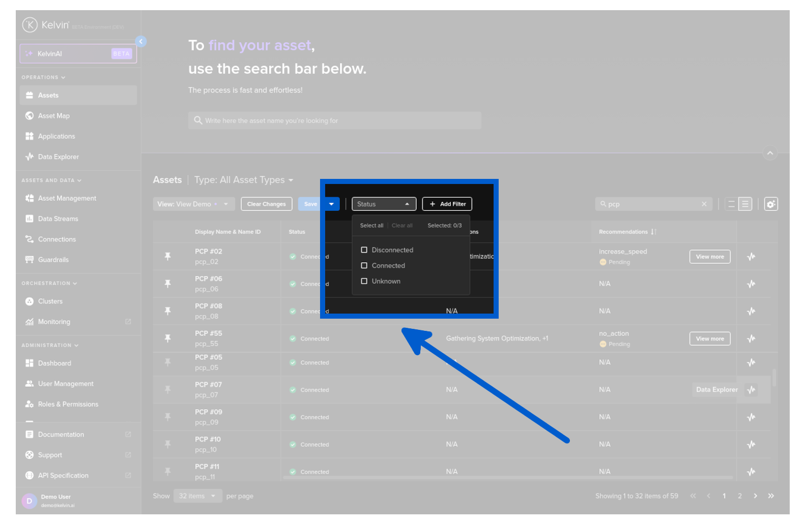 For example, if you filter only Connected Assets, running in Open Loop mode in Kelvin SmartApps™, then you will not see any Disconnected Assets even if they are running in Open Loop mode.