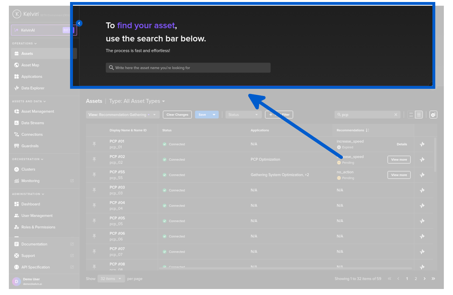 The Assets page is the first page you will see when you log into the Kelvin UI. You can also go there by clicking on the Asset option in the left sidebar.