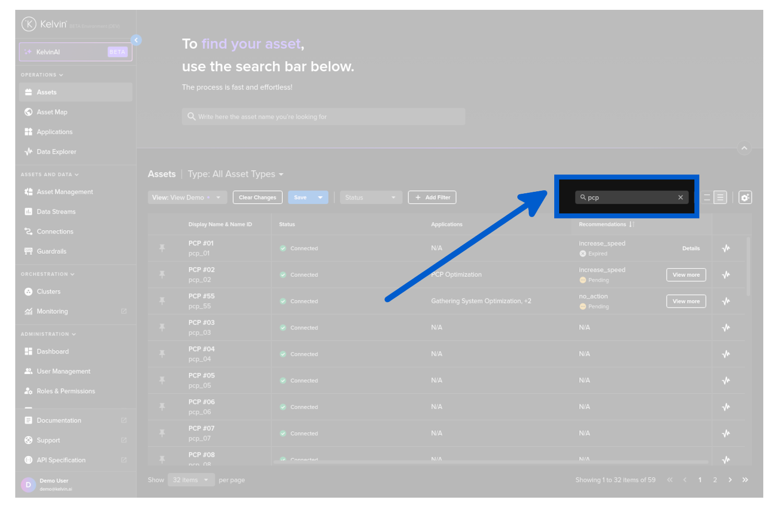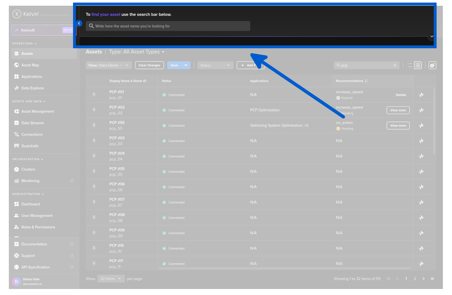 For example; if you have an Asset called Demo Asset and you type in this fuzzy search bar deo where you accidentally forgot the letter m, it will still show up in the list.