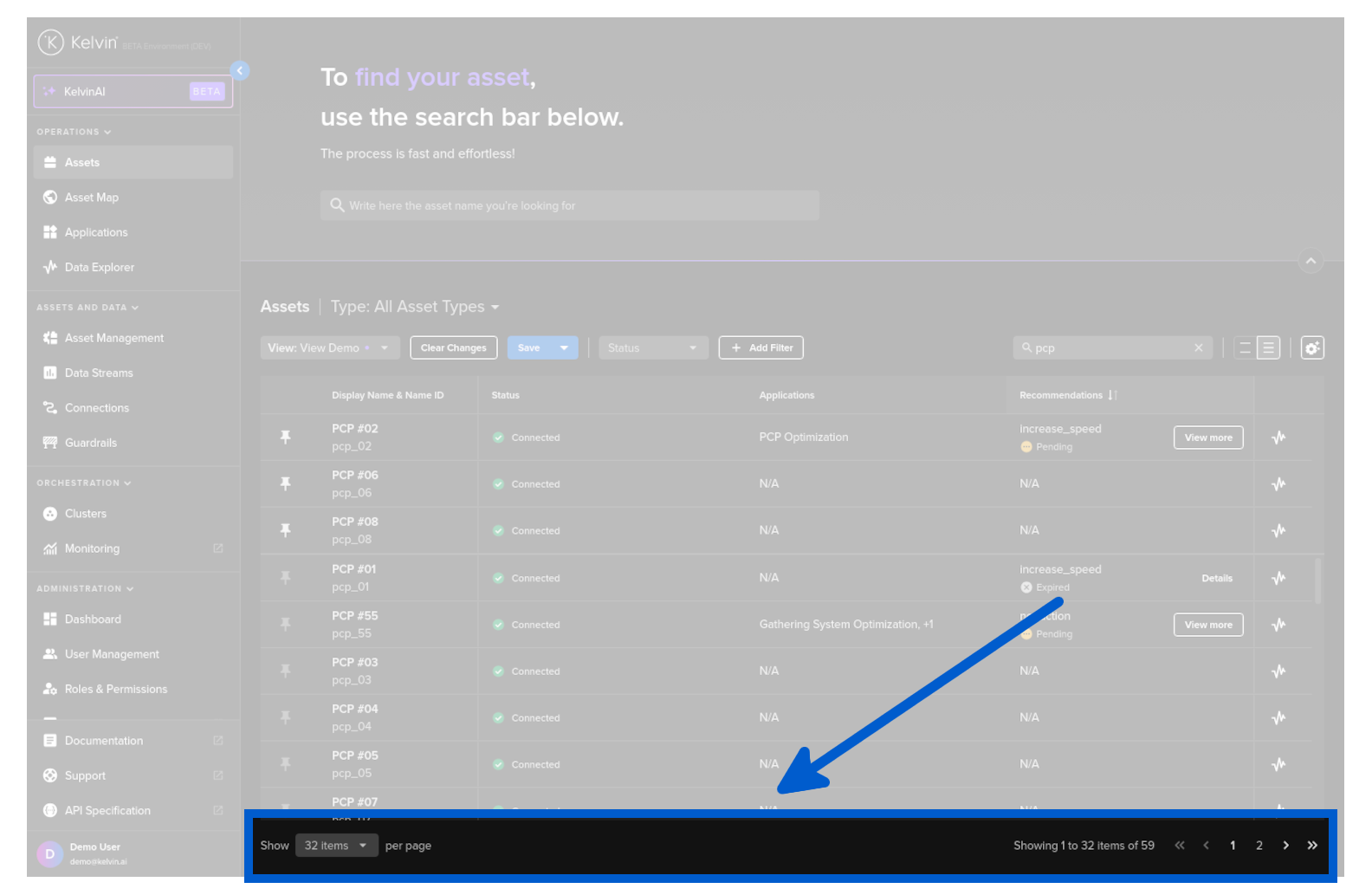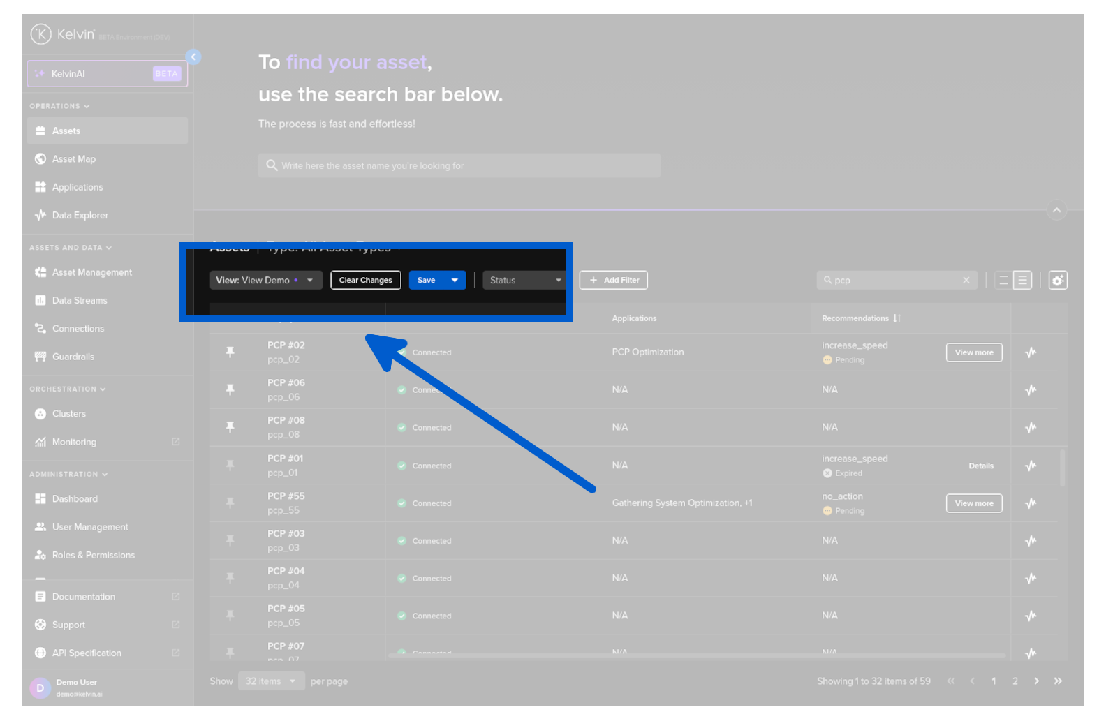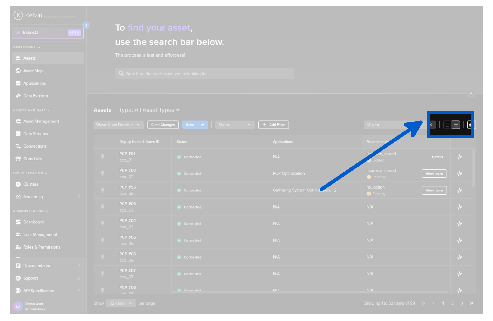 On this page you get an overview of all Assets being managed by Kelvin. You can build custom views for the overview by using information like Data Streams, Kelvin SmartApps™ configurations, Recommendations, actions like last Control Change and more.
