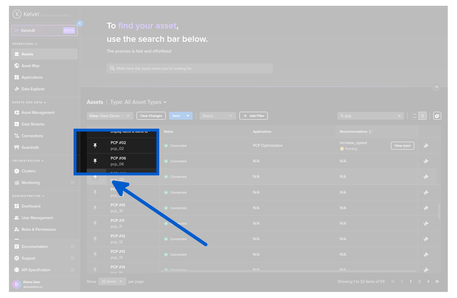 Here you have a list of all Assets registered in Kelvin. From here you can see the Assets and associated information.