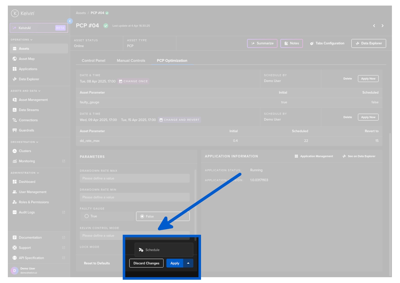 On this page you will learn about scheduling parameter changes in Kelvin UI.