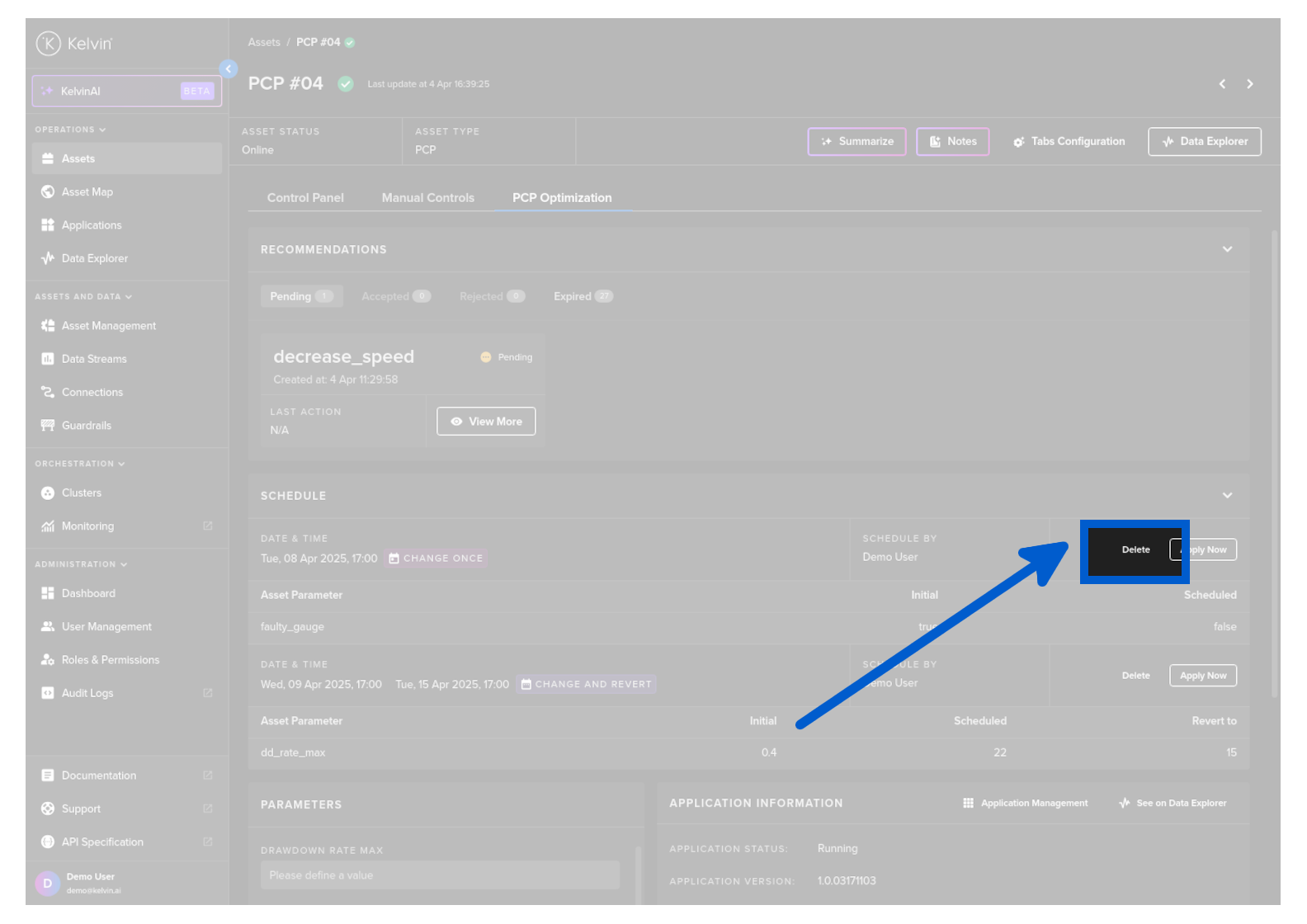 If the schedule parameter change has multiple assets to change/revert, then you can only apply/revert from Kelvin SmartApps™ page.