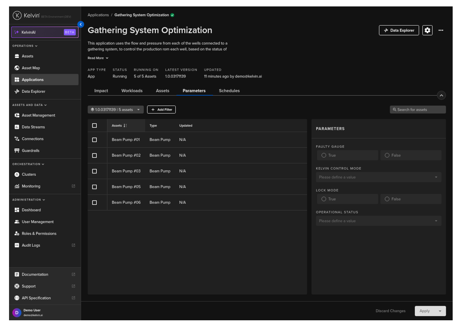 Click on the App Parameters tab, and you can see a list of Assets and the App Parameter options for Kelvin SmartApps™.