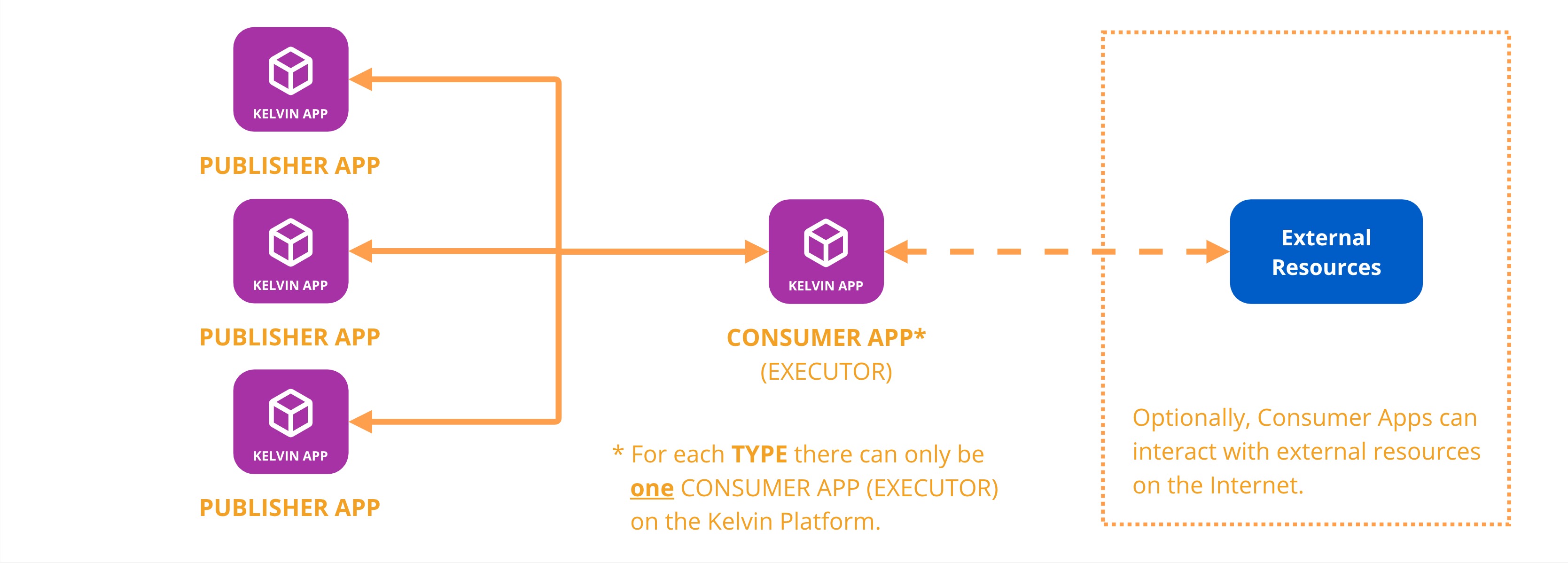For each Type declared in any Publisher App, only ONE Consumer App (Executor) can be deployed on the Kelvin Platform to receive that Type.