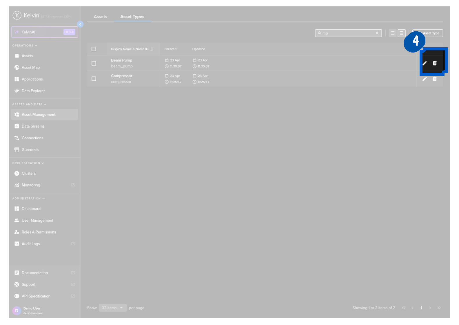 To delete an Asset Type, click on the rubbish bin icon on the right hand side of of an Asset Type row;