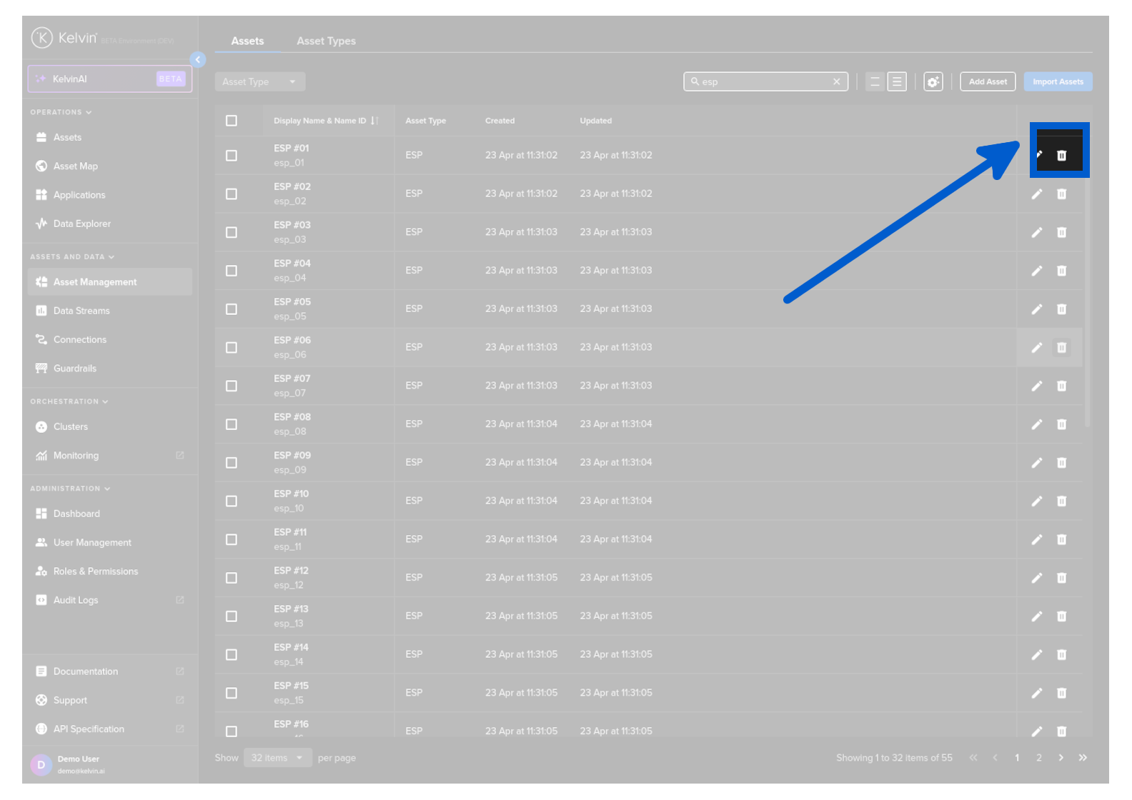 To delete an Asset, click on the rubbish bin icon on the right hand side of of an Asset row;