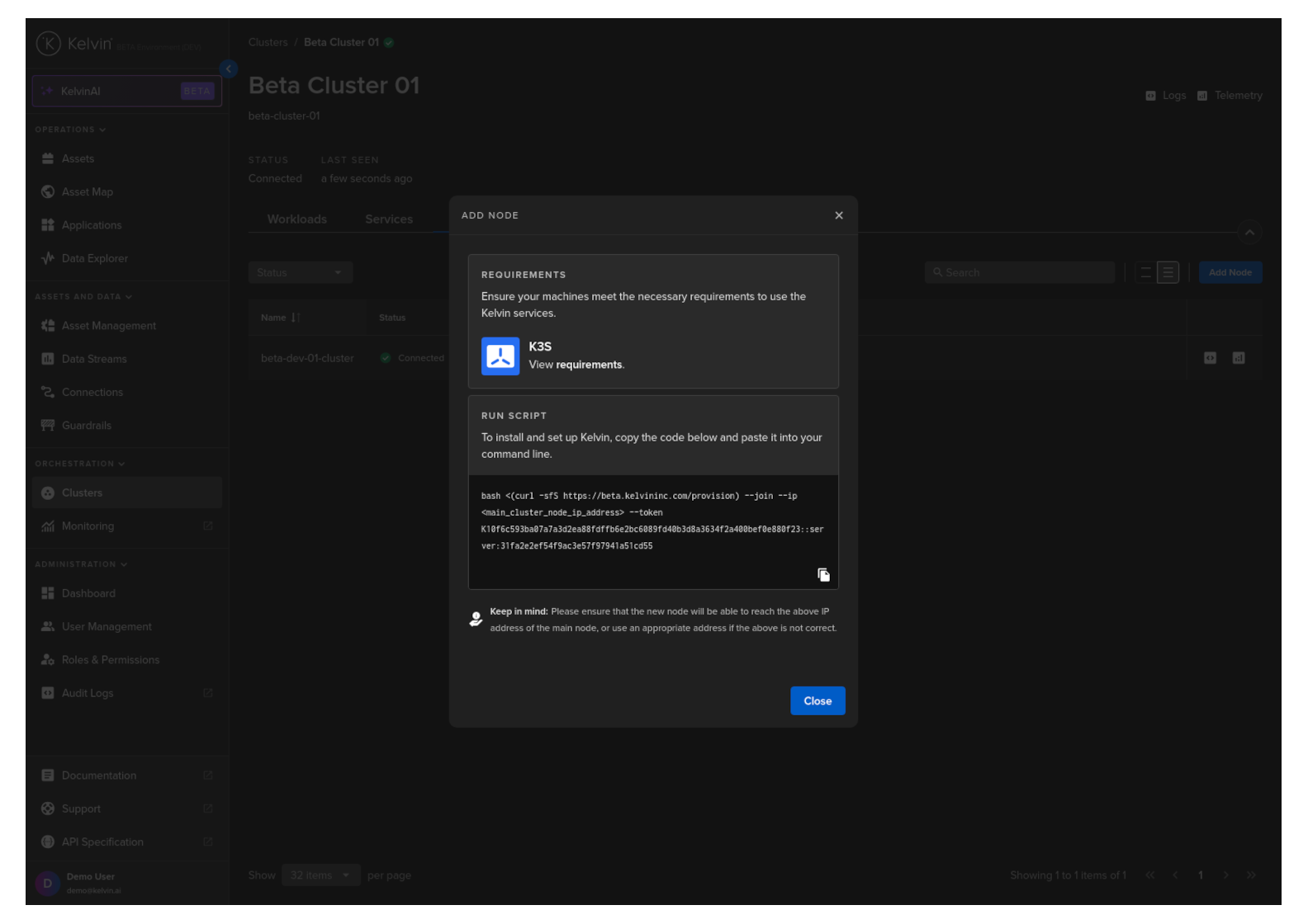 You only need to do this if you have chosen the Main Node in the Cluster to be k3s installation by Kelvin. If you manage your own Kubernetes cluster, then follow your providers instructions and Kelvin will automatically find and configure the new Nodes.