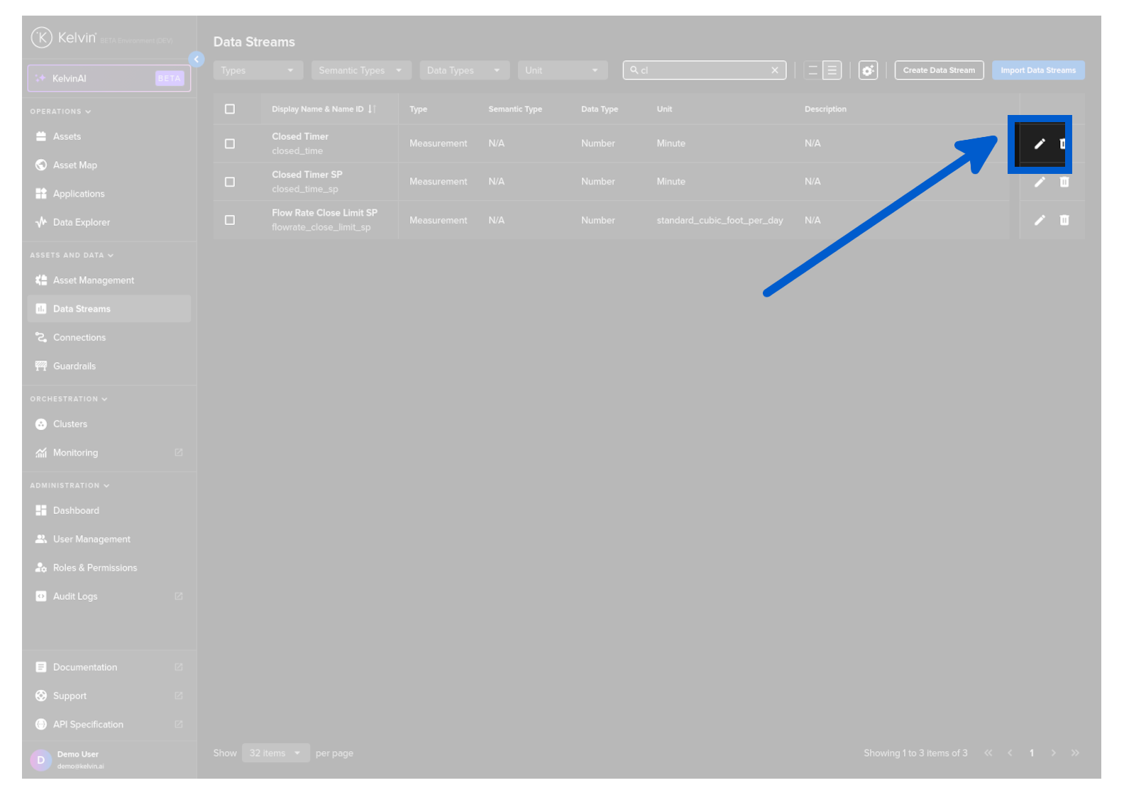Go to the Data Streams page, select the Data Stream you want to edit and click on the Pencil button on the right hand side.