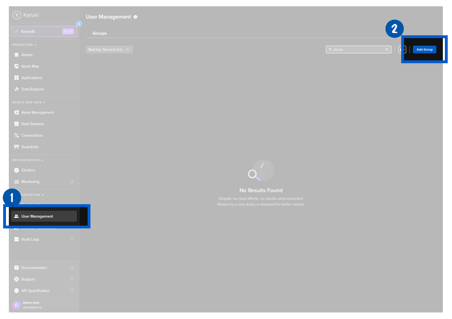 To start, click on User Management in the Administration section of the left side bar and click on the Add Group button.