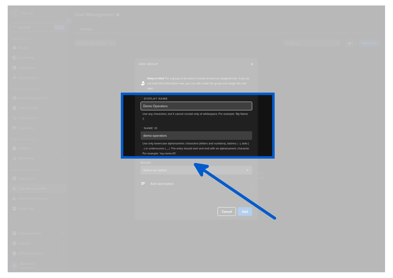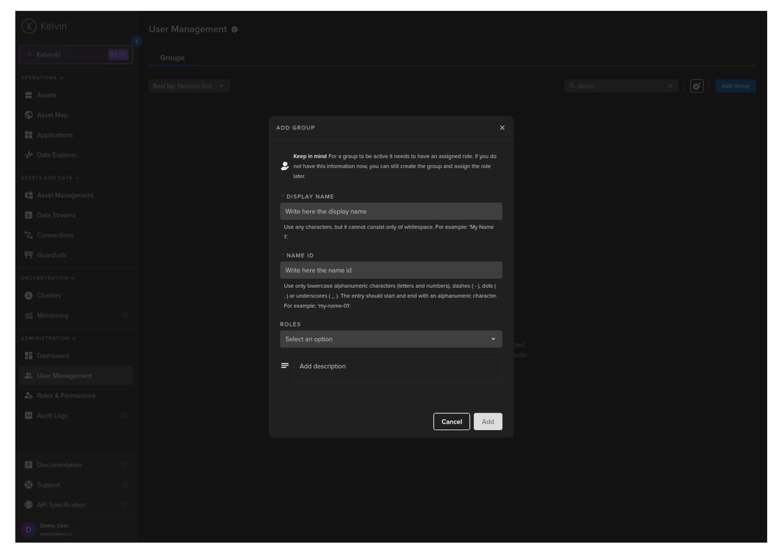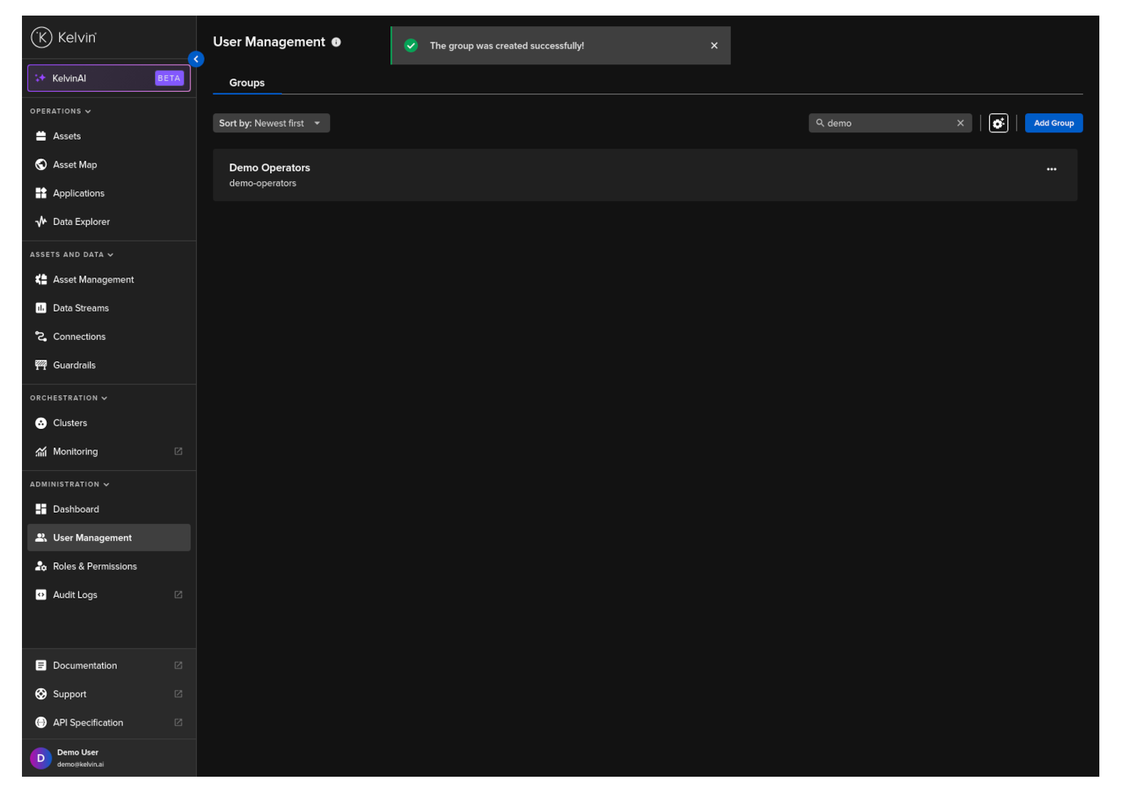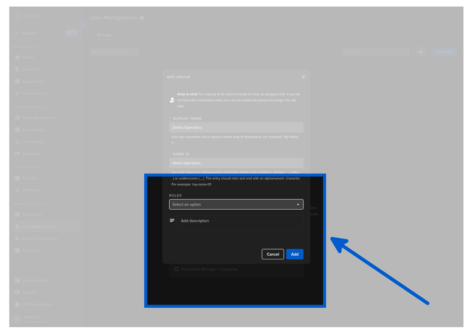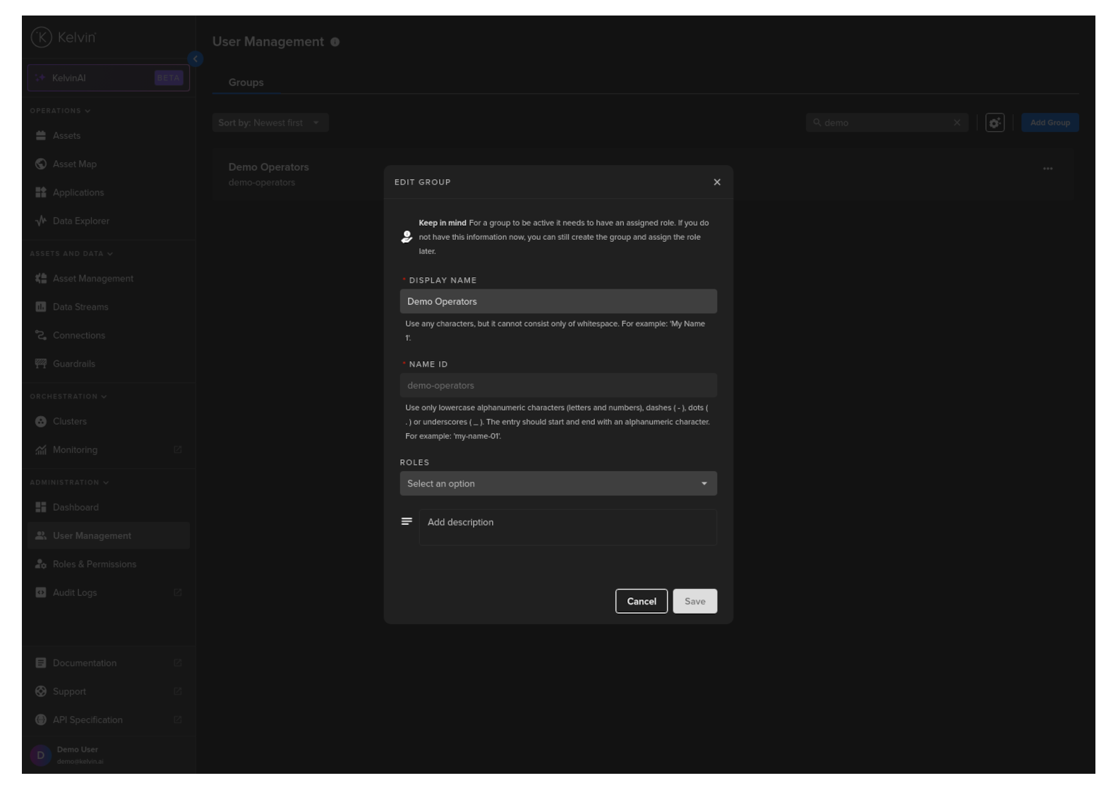 This is not the group in Keycloak or your SSO. That is managed outside of Kelvin UI.
