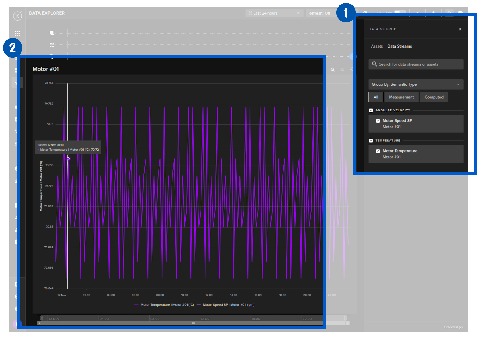 Select the data streams you want to visualize. In this case we will select the Motor Temperature and the Motor Speed Set Point data streams.
