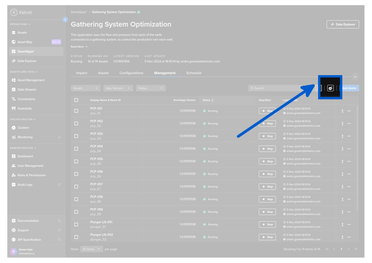 Click on the Management tab, and you can see a list of Assets and the configuration options for teh Kelvin SmartApp™.
