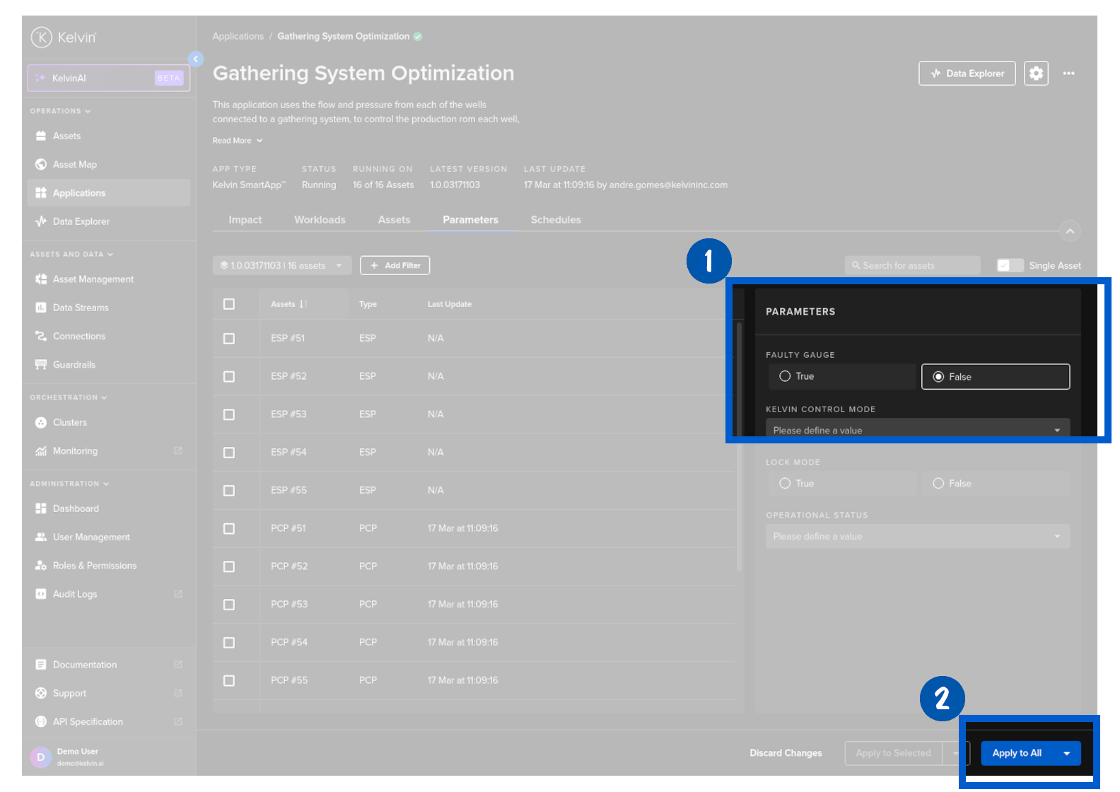 When changing the configuration values (Kelvin SmartApps™ Parameters), you can choose to change the values for one Asset, a selection of Assets or all Assets in the table.
