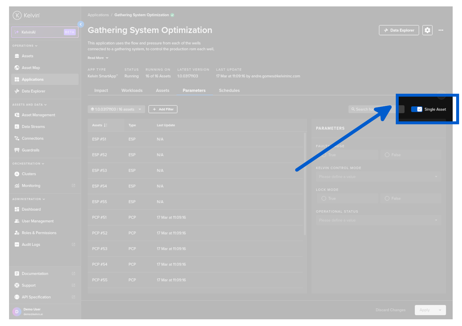 On the left hand side you will see the Assets table and on the right hand side you will see the standard configuration parameters available for Kelvin SmartApps™. You do not need to fill in all the parameters when updating, only the parameters that need new common values for all Assets selected.