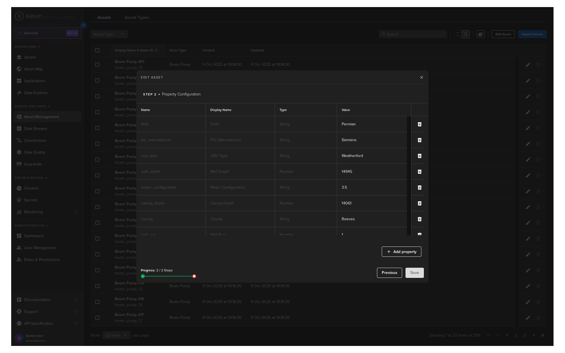 Asset Properties are any extra information you want to hold about an Asset. This can be retrieved by a Kelvin SmartApp™ for use in a program. For example you could have a Beam Pump 01 Asset, and then create an Asset Property Model to be able to distinguish between the Assets. This can be used to target the Kelvin SmartApp™ for only certain types of Models.