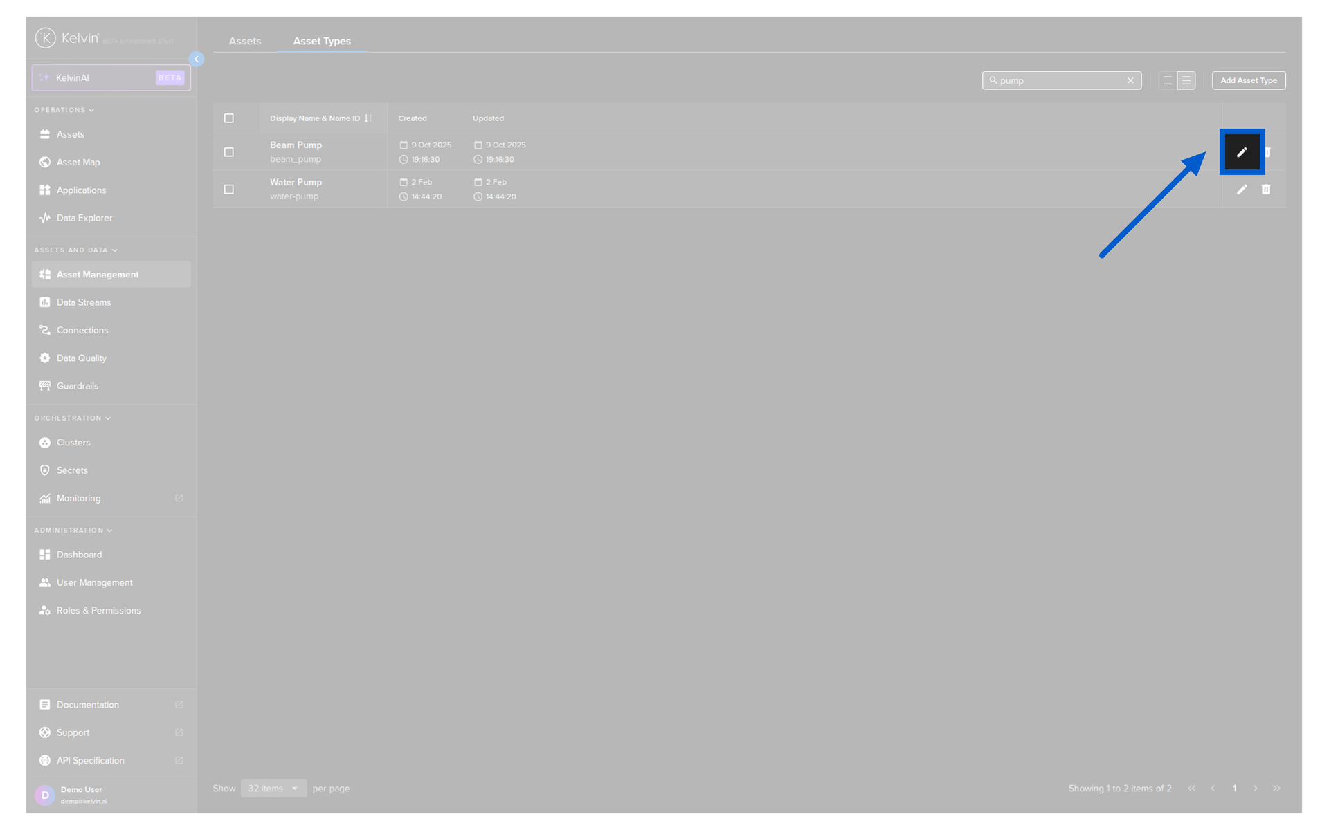 To edit an Asset Type, click on the pencil icon on the right hand side of of an Asset Type row;