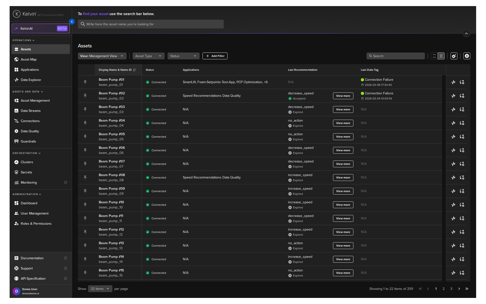 - Last Recommendations: Check and manage any active recommendations related to each asset and Kelvin SmartApp™.