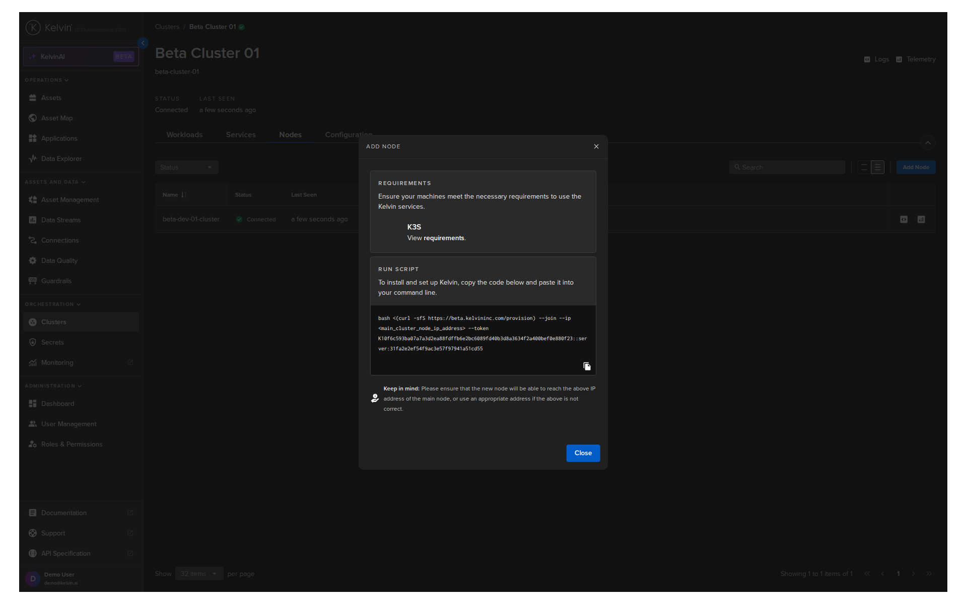 You only need to do this if you have chosen the Main Node in the Cluster to be k3s installation by Kelvin. If you manage your own Kubernetes cluster, then follow your providers instructions and Kelvin will automatically find and configure the new Nodes.