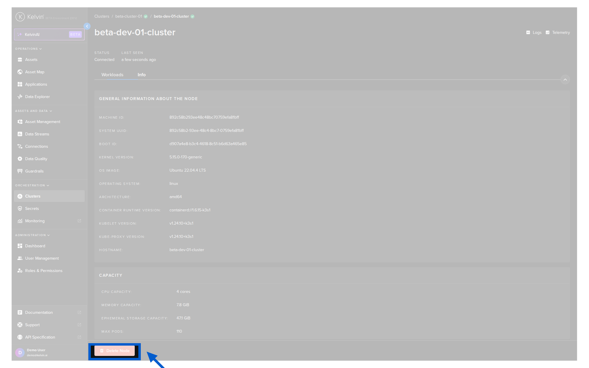 To perform this action you need to have access to the Main Node. You can find full instructions on how to delete your selected node by going to Orchestration, selecting your cluster and node, click on the Info tab and click Delete Node.