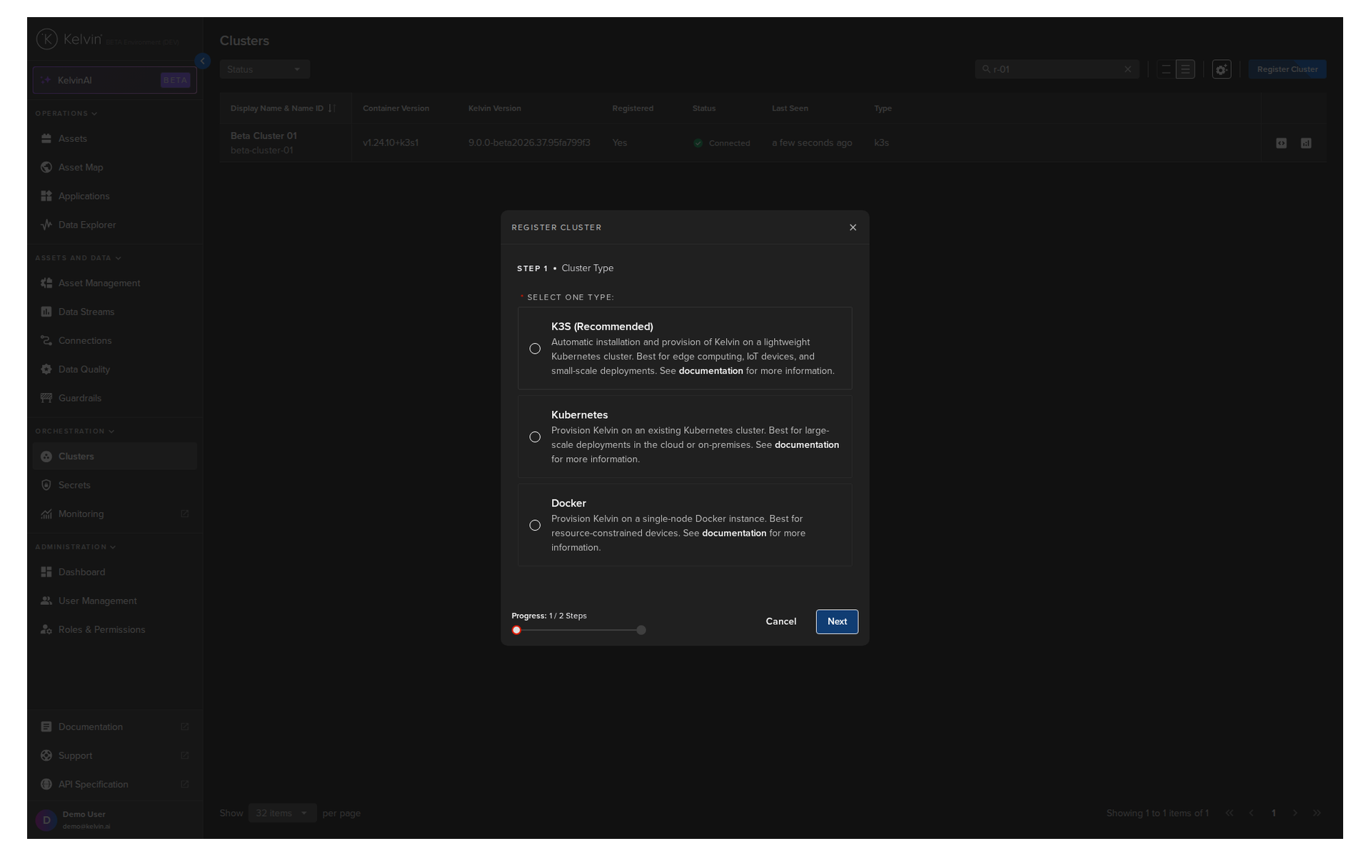 To join you Cluster to the Kelvin Platform, you will need to first create the Cluster on the Kelvin Platform through either the Kelvin UI, Kelvin API or Kelvin API Client (Python).