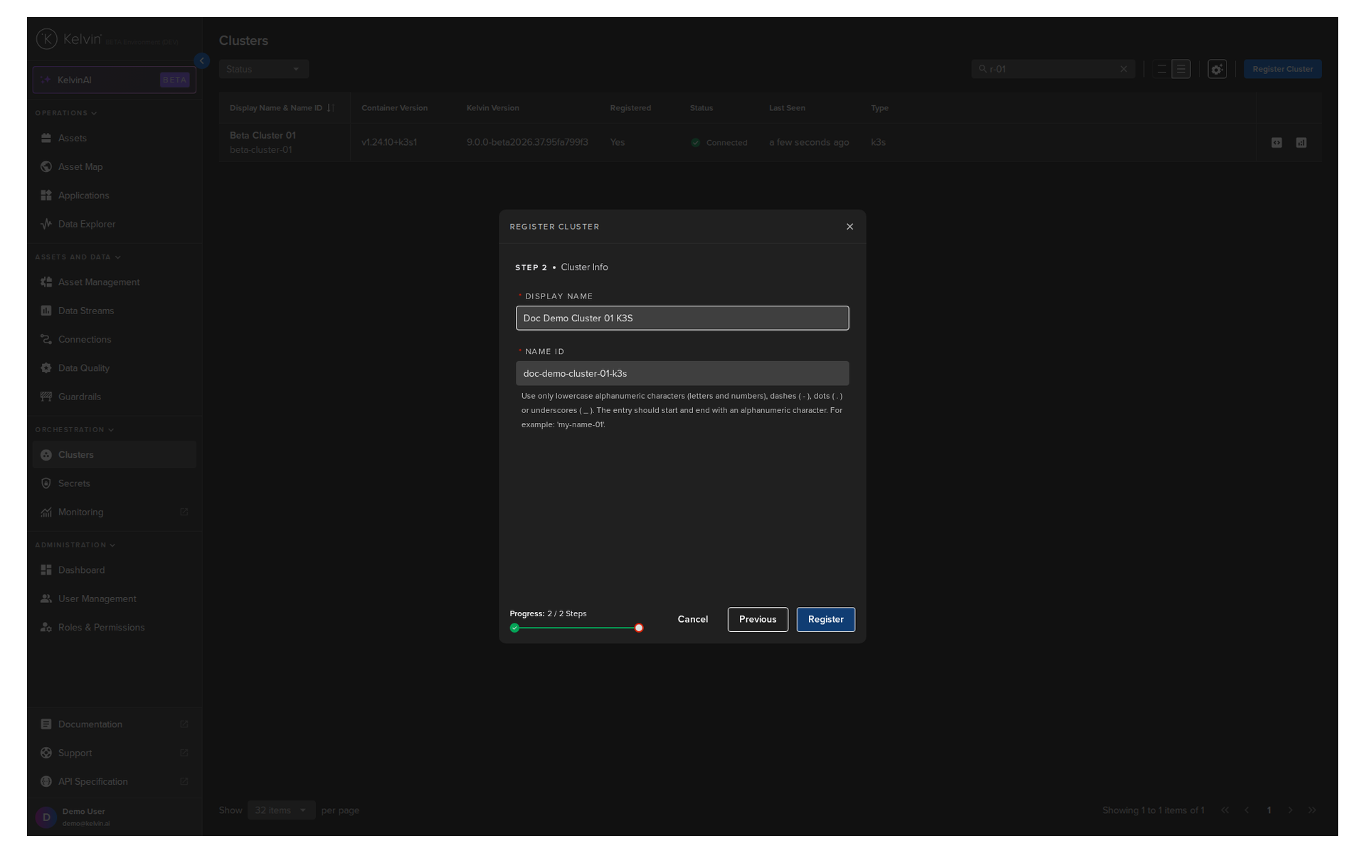 In the Kelvin UI, first head over to the Clusters section under orchestration and click on the register cluster button.