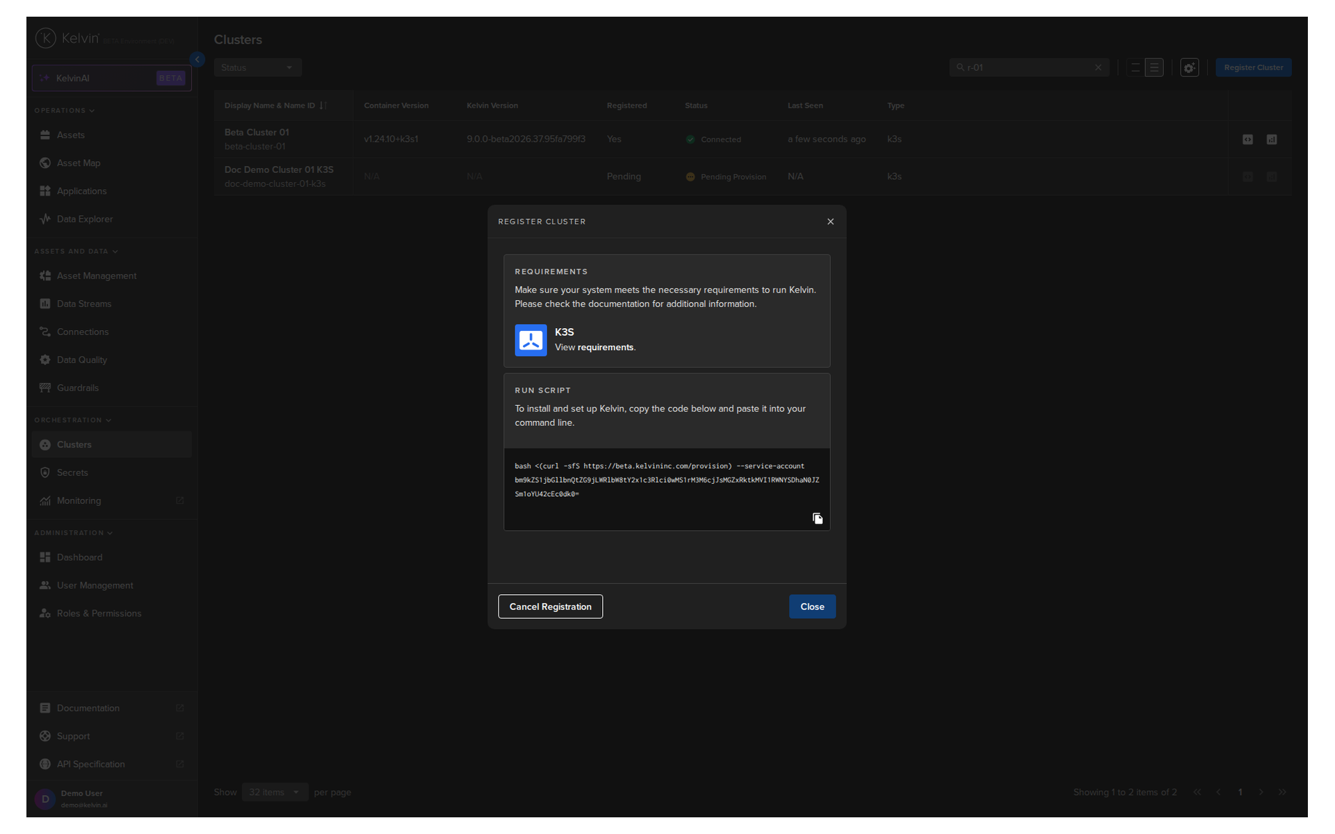The new cluster "Demo Cluster K3S" is now registered in Kelvin, run this provision script in your edge computer - "bash <(curl -sfS https://<url.kelvin.ai>/provision) --service-account bm9kZS1jbGllbnQtZGVtby1jbHVzdGVyLWszczpYdlpZTEQwc2JlU202S2c1ZDk0YzJvbGpQaFIzRjFFQQ=="
