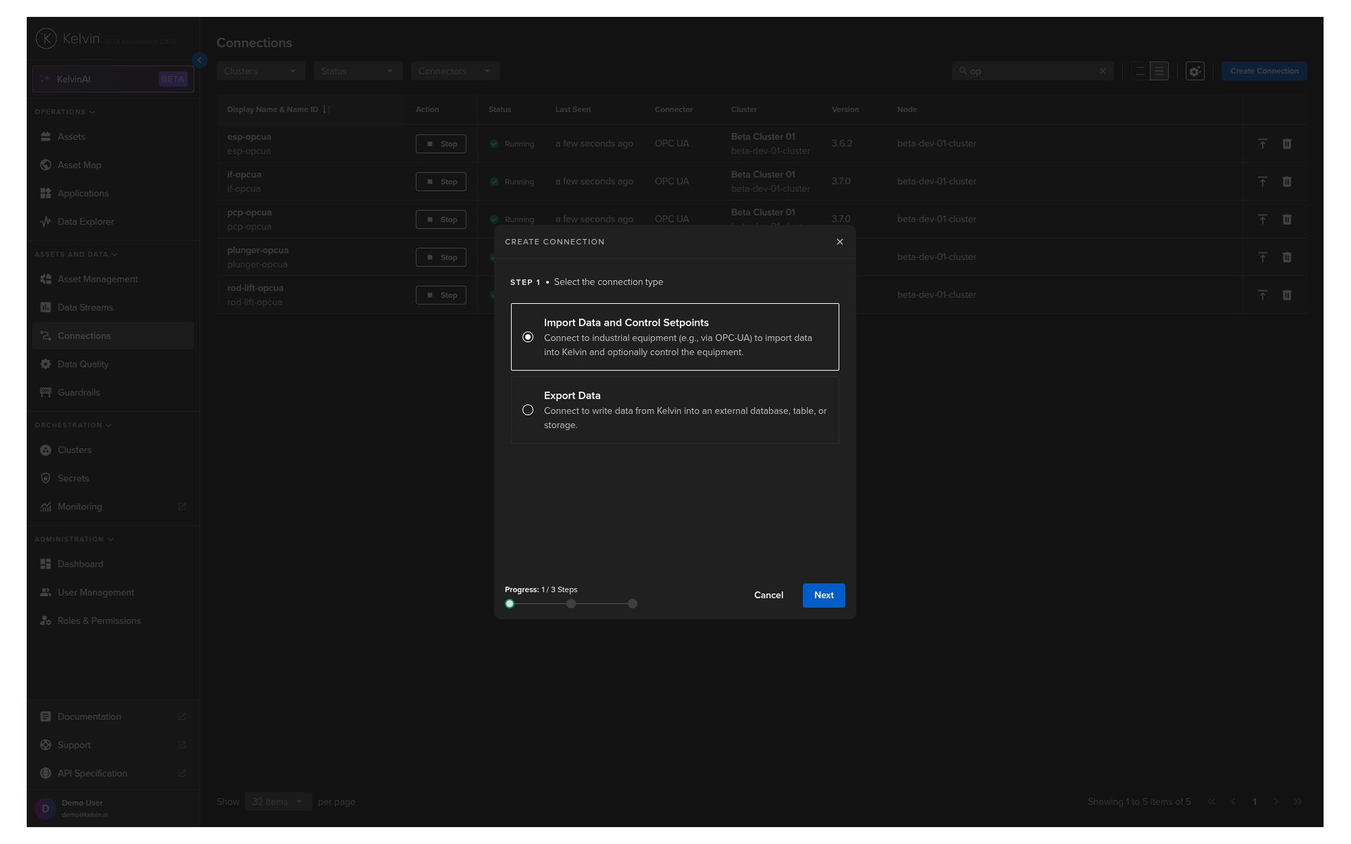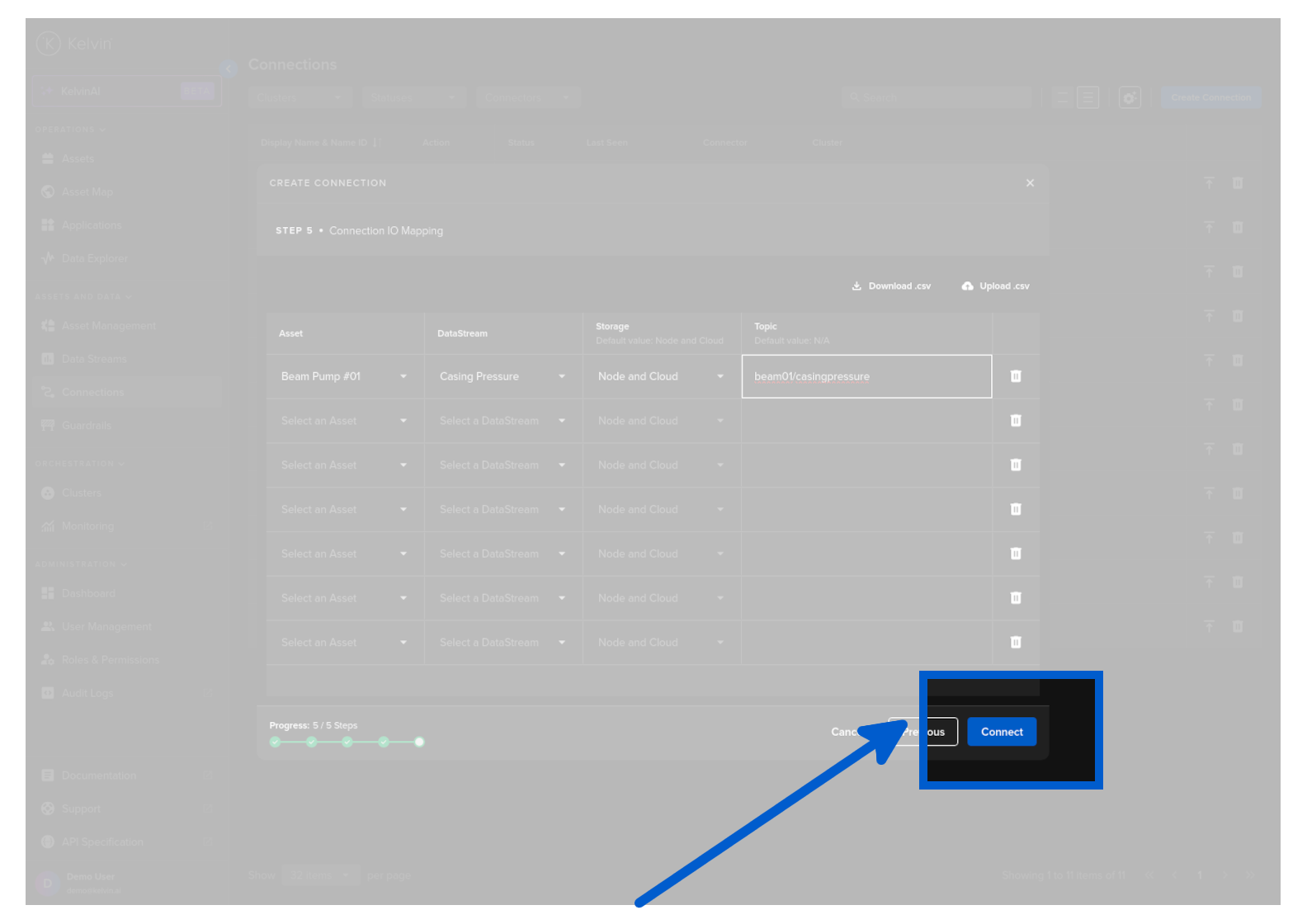 When everything is validated, then you can click on Connect button to deploy the Connection to the Cluster. It will start automatically, connect to the asset and start collecting data.