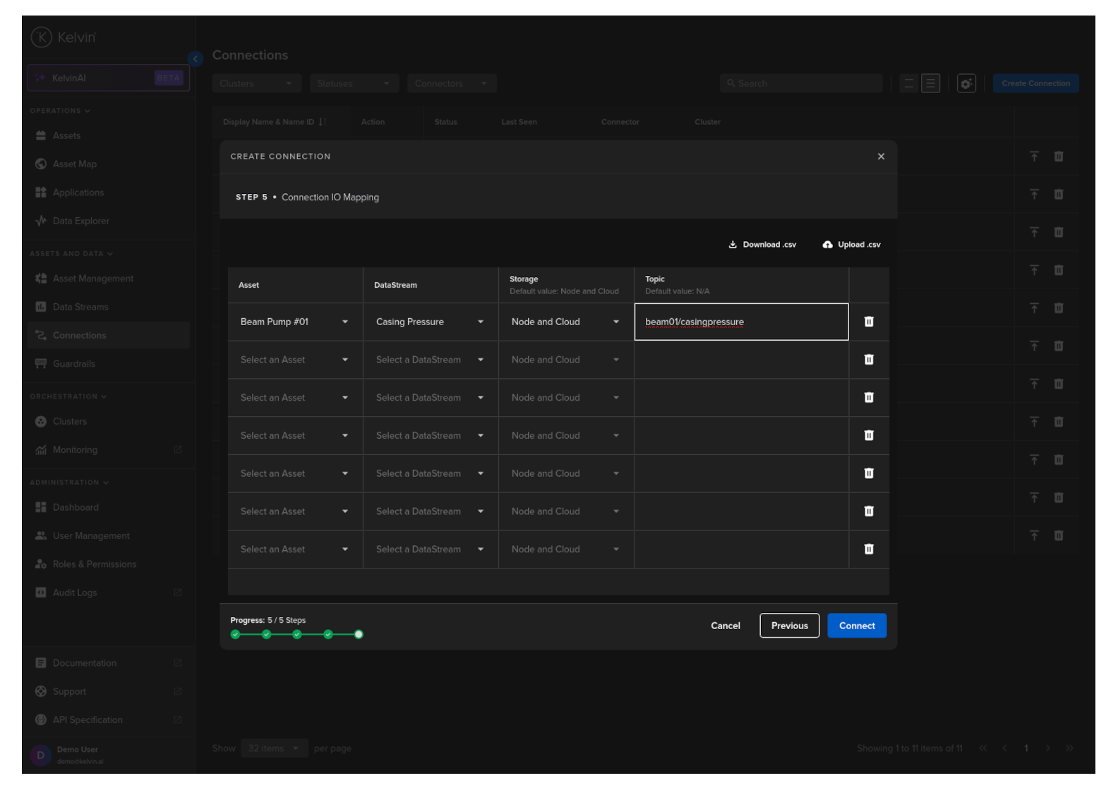 If you have many connection IO to fill in, you can save time with the download/upload csv file option in the top right hand corner of the popup.