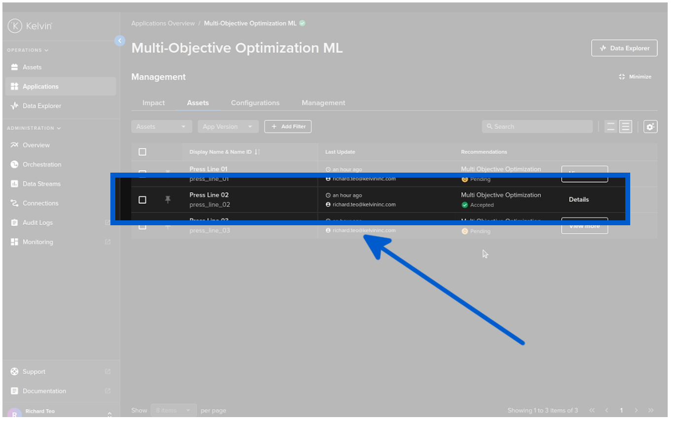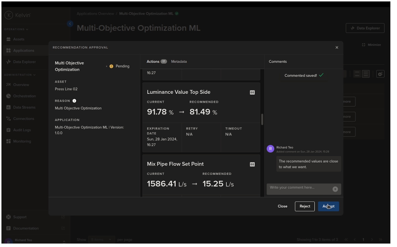 When the model output has optimized settings for the Assets, they will be packaged into a Recommendation and sent to the Kelvin UI for the Process Engineer to inspect and make the final decision.