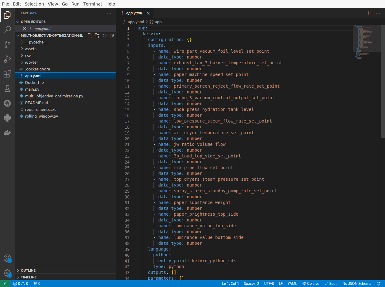 Within the new folder that is created, the Developer first can add the inputs, outputs and parameters to the app.yaml file. This connects the variables in the program with the Data Streams in Kelvin.